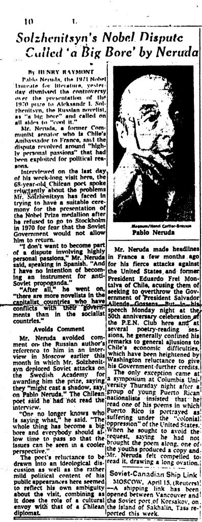 Mr. Neruda made headlines in France a few month ago for his fierce attacks against the United States…But he generally confined his remarks….The only exception came at a symposium at Columbia University Thursday night after a group of young Puerto Rican nationalists inisted that he read one of his poems in which Puerto Rico is portrayed as suffering under the “colonial oppression” of the United States. When he sought to avoid the request, saying the had not brought the poem alone, one of the youths produced a copy and Mr. Neruda felt compelled to read it, drawing a long ovation.