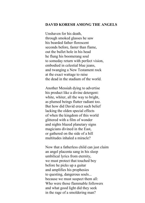 Poets Note: David Koresh ( born Vernon Wayne Howell on August 17, 1959) was the young leader of a Branch Davidian religious sect, who pursued a dual career as divinely elected prophet and rock singer, using music to attract young followers to his sect. On April 19, 1993 he and seventy five followers did not survive an F.B.I. siege during which–the cause a lingering controversy–their compound in Waco, Texas was set ablaze.