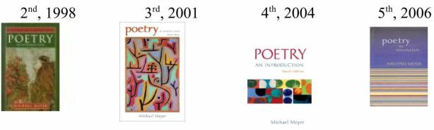 Since 1993, “Ethnic Poetry” has been a selection in the following past editions and titles of Bedford/St. Martin’s college texts, hardbound and compact (paperback), The Bedford Introduction to Literature, The Compact Bedford Introduction to Literature, and Poetry: An Introduction, all edited by Michael C. Meyer: