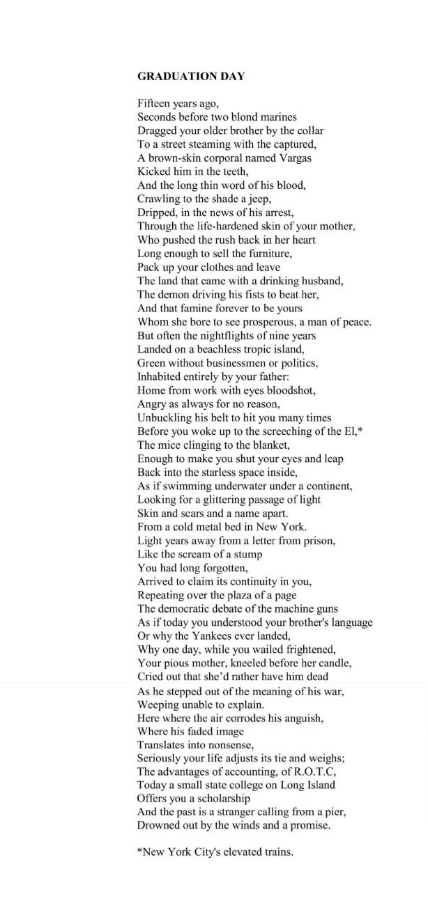 Poets Note: “Graduati0n Day,” very much a seventies poem, is based on a high school student I once had who was torn between outgrowing a difficult childhood to make himself a functional life and staying loyal to his brother, who was committed to the struggle for Puerto Rican independence.